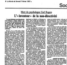 Le psychologue psychanalyste Carl Rogers, rendu célèbre par le terme de non-directivité qu'il avait créé puis abandonné dans les années 40, est mort en Californie, à l’âge de quatre-vingt-cinq ans, dans la nuit du 4 février. |